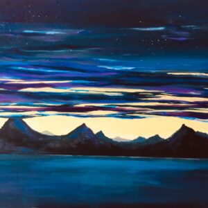 An abstract painting capturing the essence of autumn in a forest. Dominated by warm, muted red and orange tones that evoke the feeling of the season. The viewer’s perspective is walking along the illuminated path through a canopy of trees, creating a sense of immersion in the silent forest’s depths. The overall effect is one of warmth and vibrancy, evoking all our senses, surrounded by the captivating colours and beauty of autumn