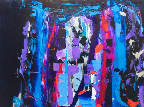 Celebration is an explosion of colour and emotion; a visual dance between darkness and light. Deep indigos and violets form the backdrop, while flashes of crimson, turquoise, and white break through like moments of joy emerging from shadow.