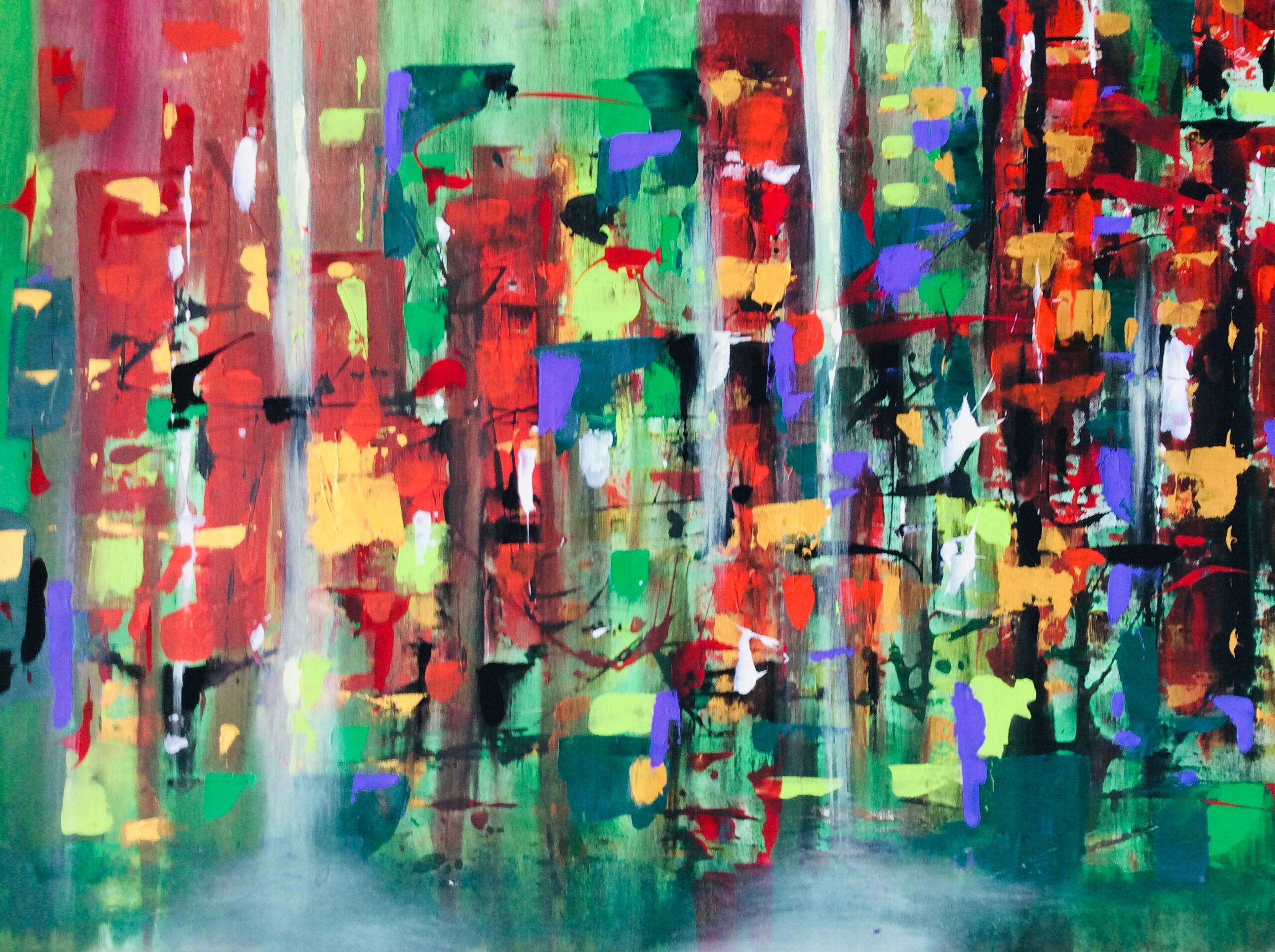 Downtown captures the heartbeat of the city; its chaos, colour, and constant motion. Layers of bold pigment collide and mingle, echoing the rhythm of streets alive with movement and sound. Amidst the intensity of reds, greens, and flashes of light, there’s both tension and harmony, reflecting the pulse of human life within urban spaces.