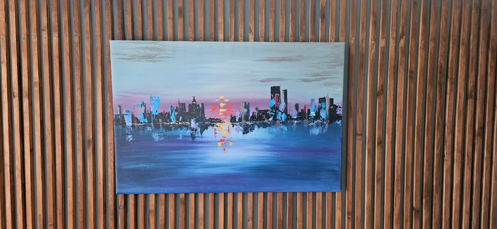 Bold colours dance across the canvas, capturing the essence of Liverpool’s skyline in an abstract embrace. Long, feathered grey clouds drift across the calm dusk sky setting the stage for the drama below. The city’s architecture, rendered in bold strokes of black and blue, rises from the depths, casting long shadows that stretch across the deep blue sea. As the sun descends, a fiery kiss of red and gold illuminates the scene, casting a warm glow upon the sea, a mirror of the sky’s dynamic hues, adding another layer of visual intrigue. The painting is a study in contrasts: the cool tones of the sky and sea against the warm hues of the sunset, the sharp lines of the buildings against the fluid strokes of the shadows. It is a dynamic composition that captures the energy and vibrancy of Liverpool, a city that is constantly evolving and reinventing itself.
