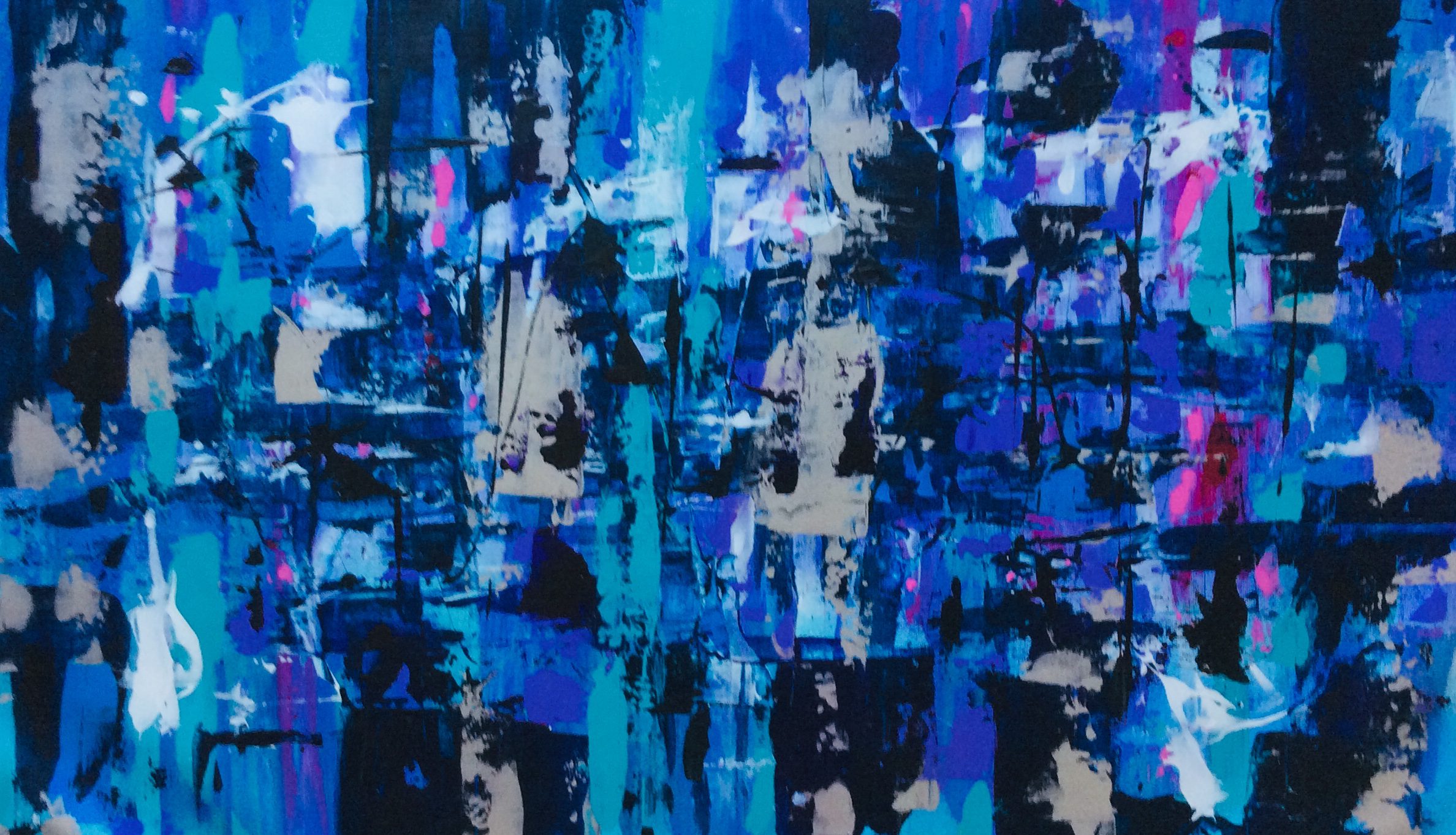 A palette of predominantly cool colors explores the concept of reflection in an abstract context creating a sense of depth and luminosity. The painting invites contemplation, as the viewer’s gaze is drawn into the subtle movements and elusive patterns that seem to dance across the surface, prompting questions about perception and the nature of reality.